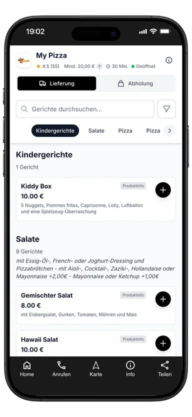 mit Essig-Öl-, French- oder Joghurt-Dressing und Pizzabrötchen - mit Aioli-, Cocktail-, Zaziki-, Hollandaise oder Mayonnaise +2,00€ - Mayonnaise oder Ketchup +1,00€